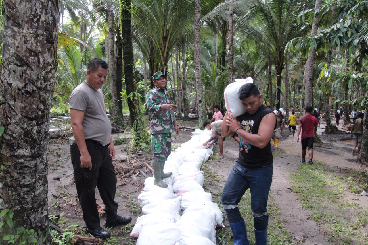 RSPD Halut - Tim Penanganan bencana banjir di desa Doitia, kecamatan Loloda utara, kabupaten Halmahera Utara, membuat tanggul sementara dari karung untuk menghambat banjir susulan.